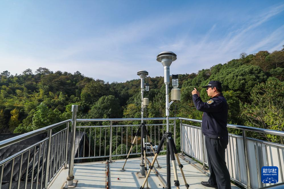 浙江省湖州市吴兴区道场乡综合行政执法中队工作人员查看道场乡空气自动监测站点,确保站点安全稳定运行(2024年10月29日摄)。新华社记者 徐昱 摄