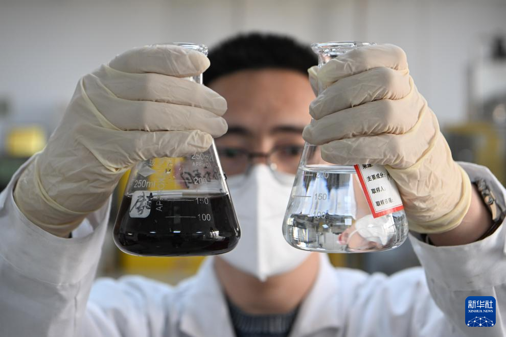 中海油天津化工研究设计院国家工业水处理工程技术研究中心的科研人员展示工业废水和经技术处理的循环水(2023年3月22日摄)。该中心主要在工业节水与废水资源化成套技术等领域进行科研攻关,成果广泛运用于石油开采、石油炼化、钢铁冶炼、煤化工等行业中,助力工业废水的资源化利用。新华社记者 孙凡越 摄