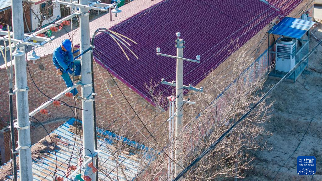 当地供电部门工作人员在宁夏吴忠市同心县河西镇旱天岭村进行“煤改电”配套供电工程施工(2025年11月27日摄,无人机照片)。新华社记者 杨植森 摄