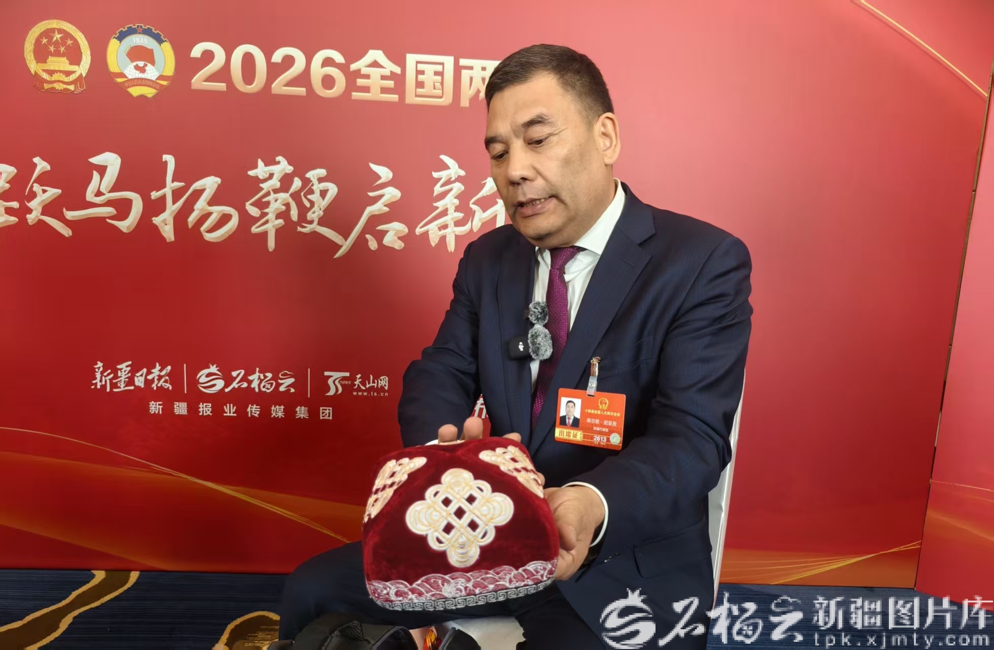 全国人大代表库尔班·尼亚孜向记者展示他带来的小花帽。石榴云/新疆日报记者 黑宏伟摄