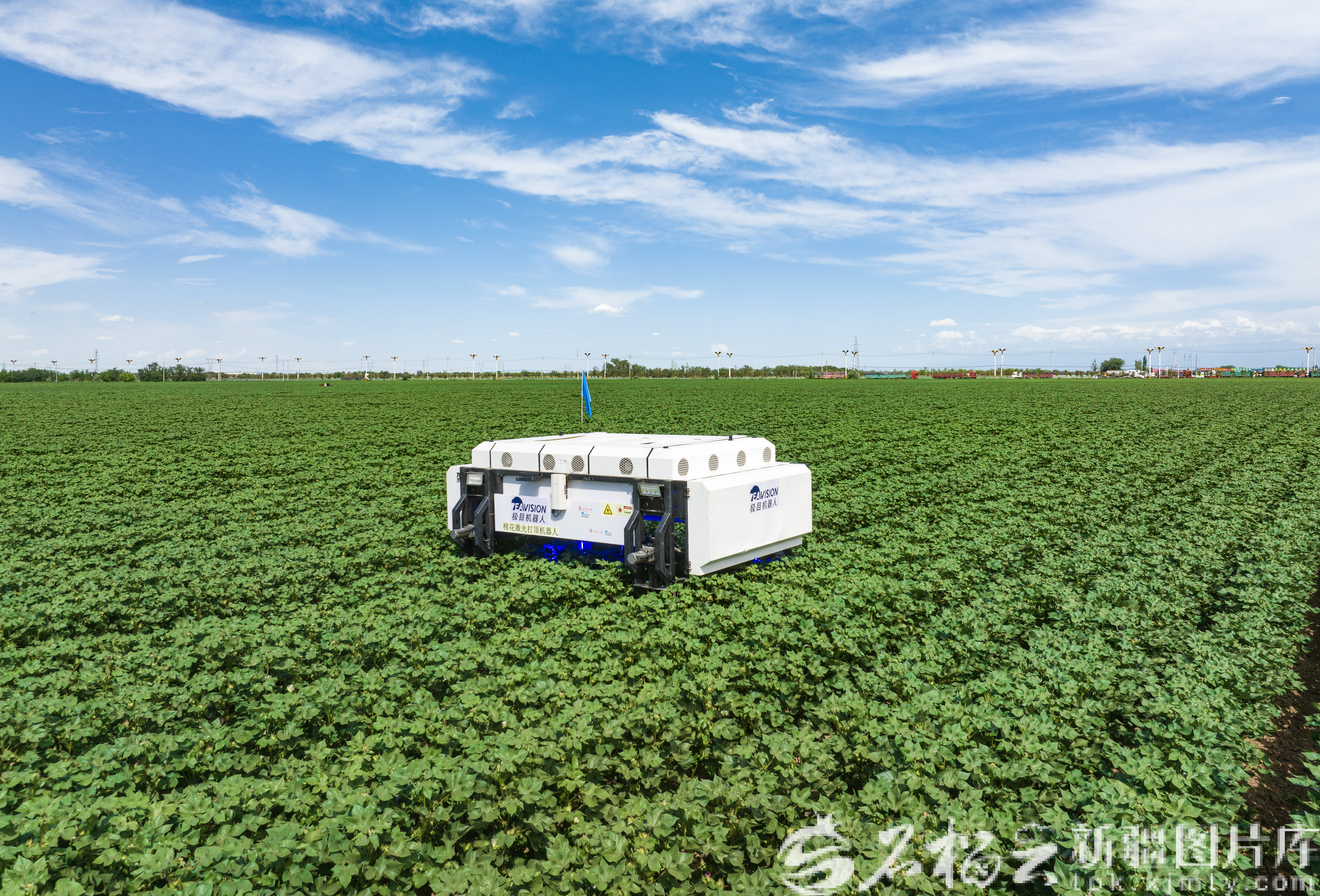 在昌吉市榆树沟镇榆树沟村的棉田里,棉花激光打顶机器人正在作业(资料图)。何龙摄