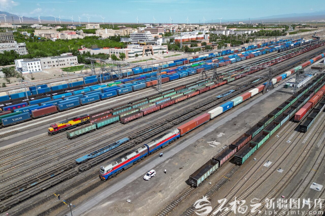 阿拉山口站一列列中欧(中亚)班列停放整齐整装待发(资料图)。石榴云/新疆日报记者 蔡增乐摄