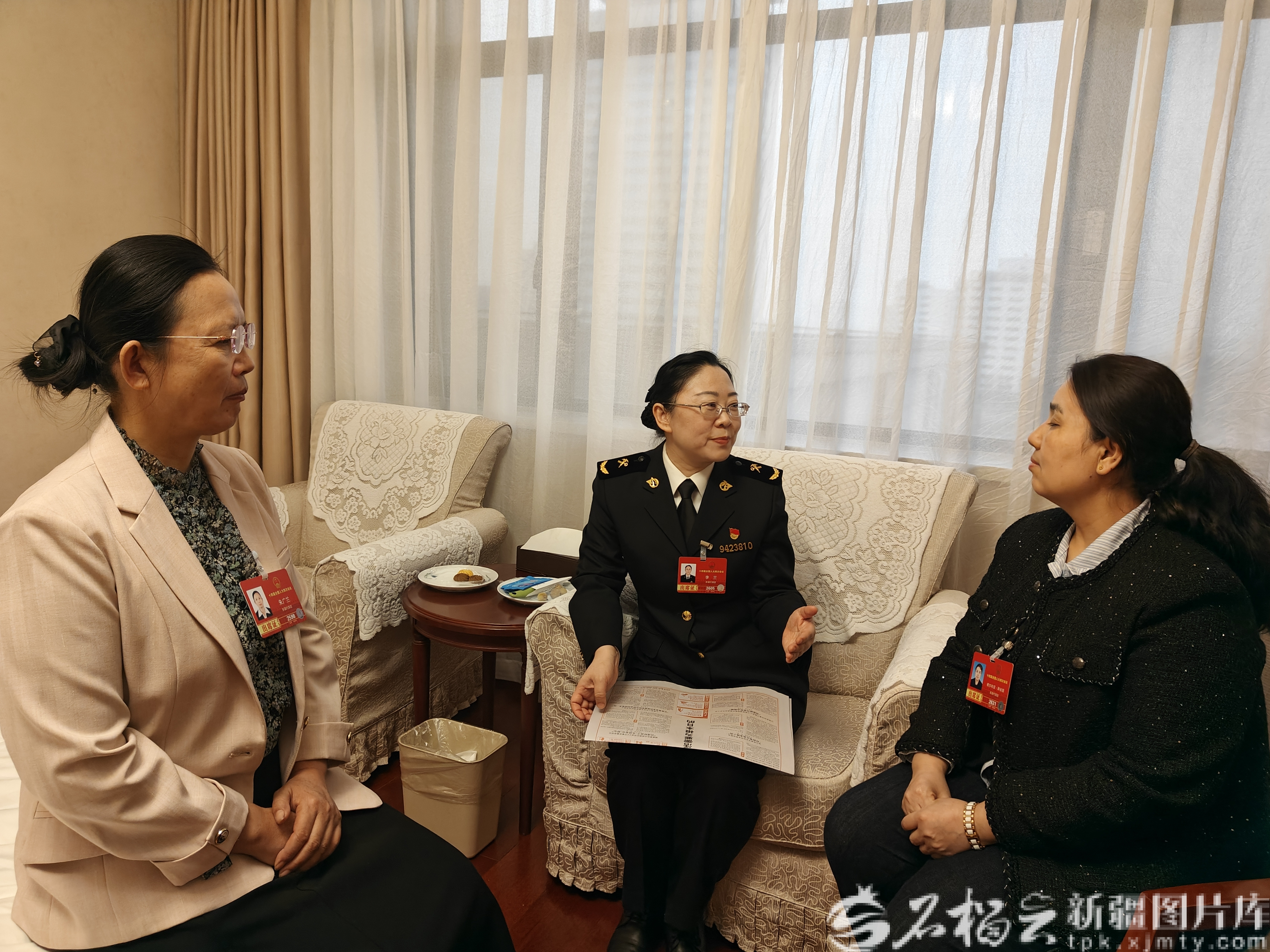 3月4日,朱广兰(左)、李兰(中)与偌尔布亚·斯依提(右)三位全国人大代表在驻地交流。本人供图