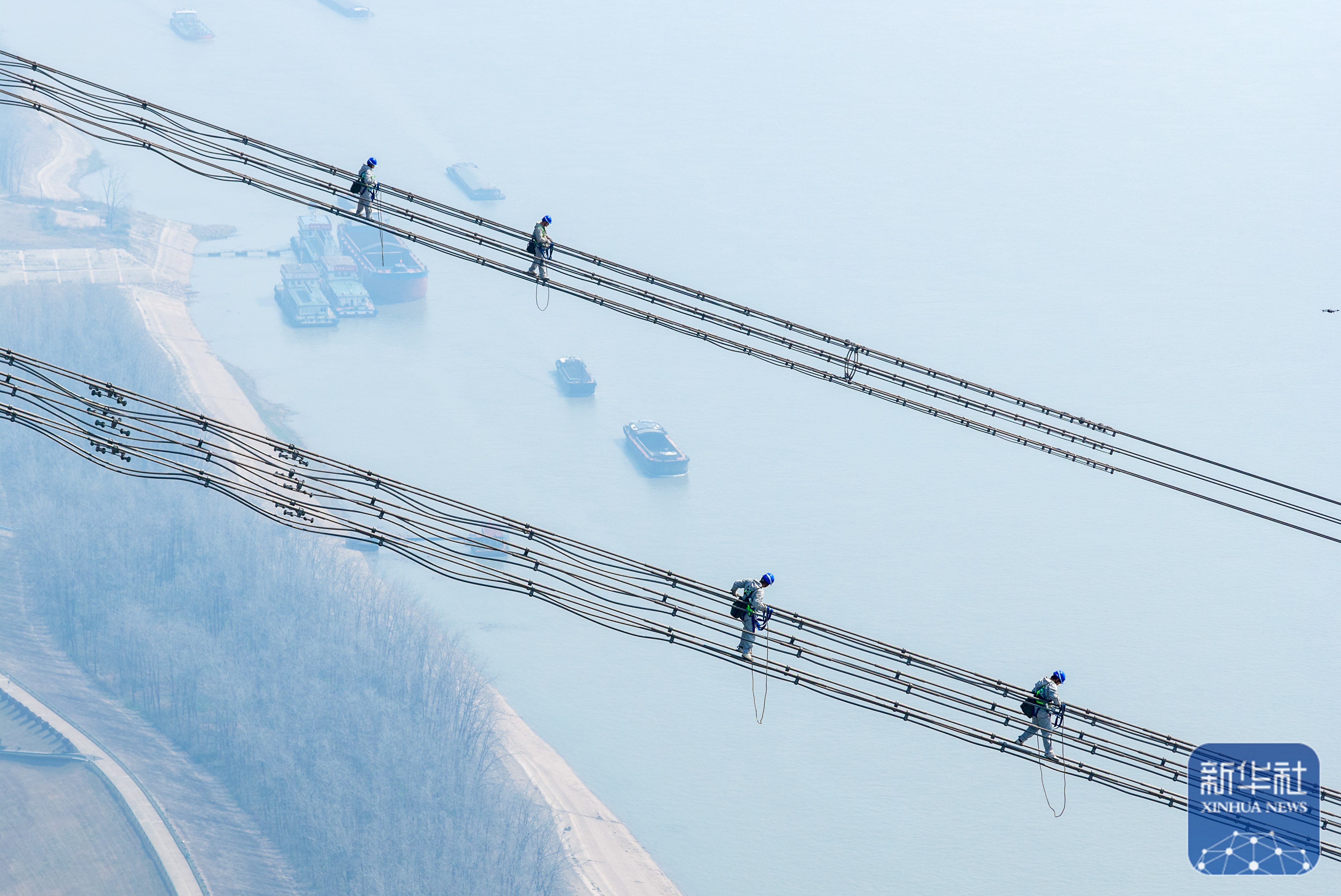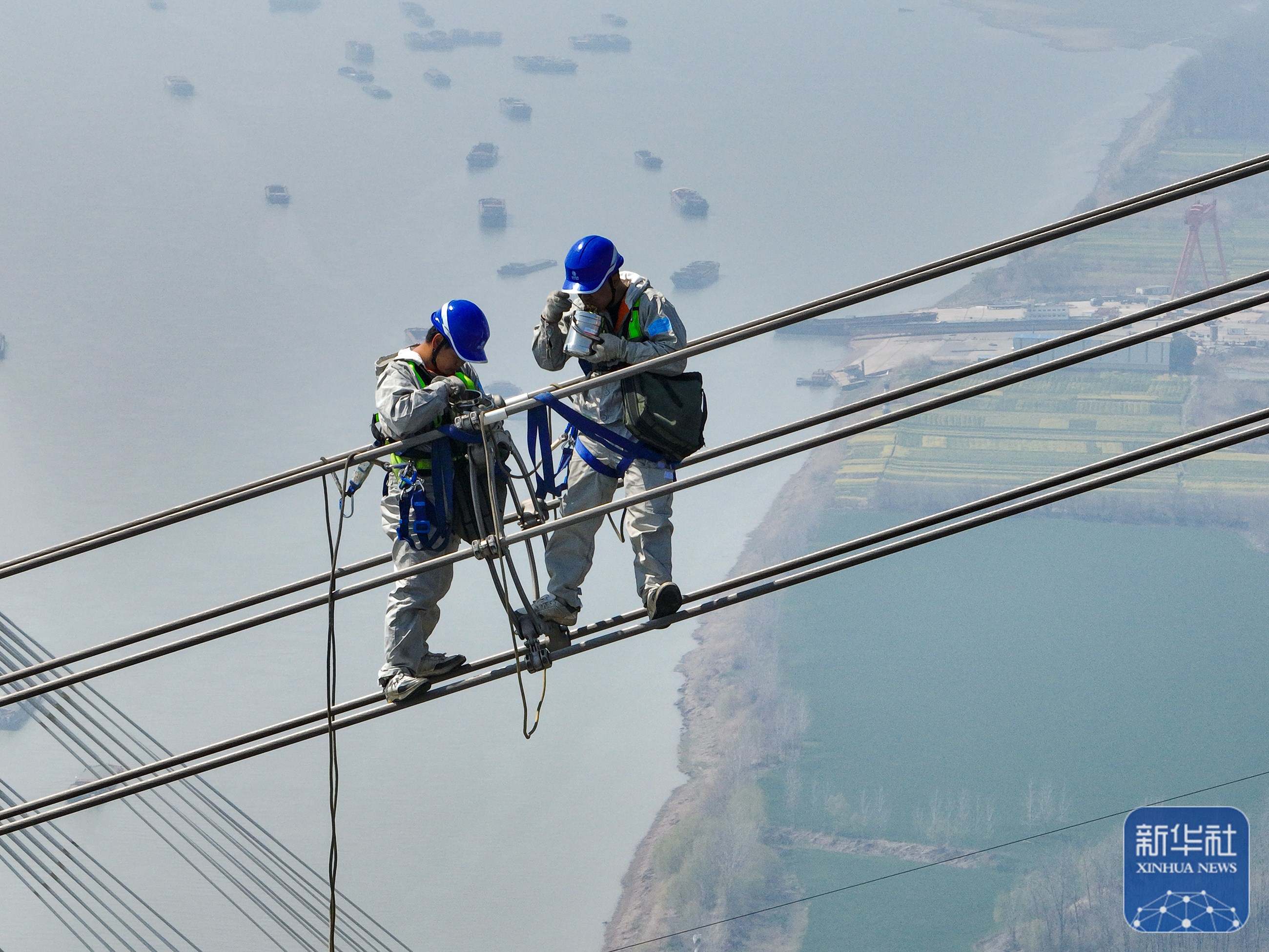 近日,我国“西电东送”重要通道——±800千伏特高压金塘线启动全面检修。在安徽省铜陵市枞阳县长江边,检修工人穿戴专业防护设备,在最高达345米的特高压输电线路上攀爬走线、精心作业,保障输电线路安全。