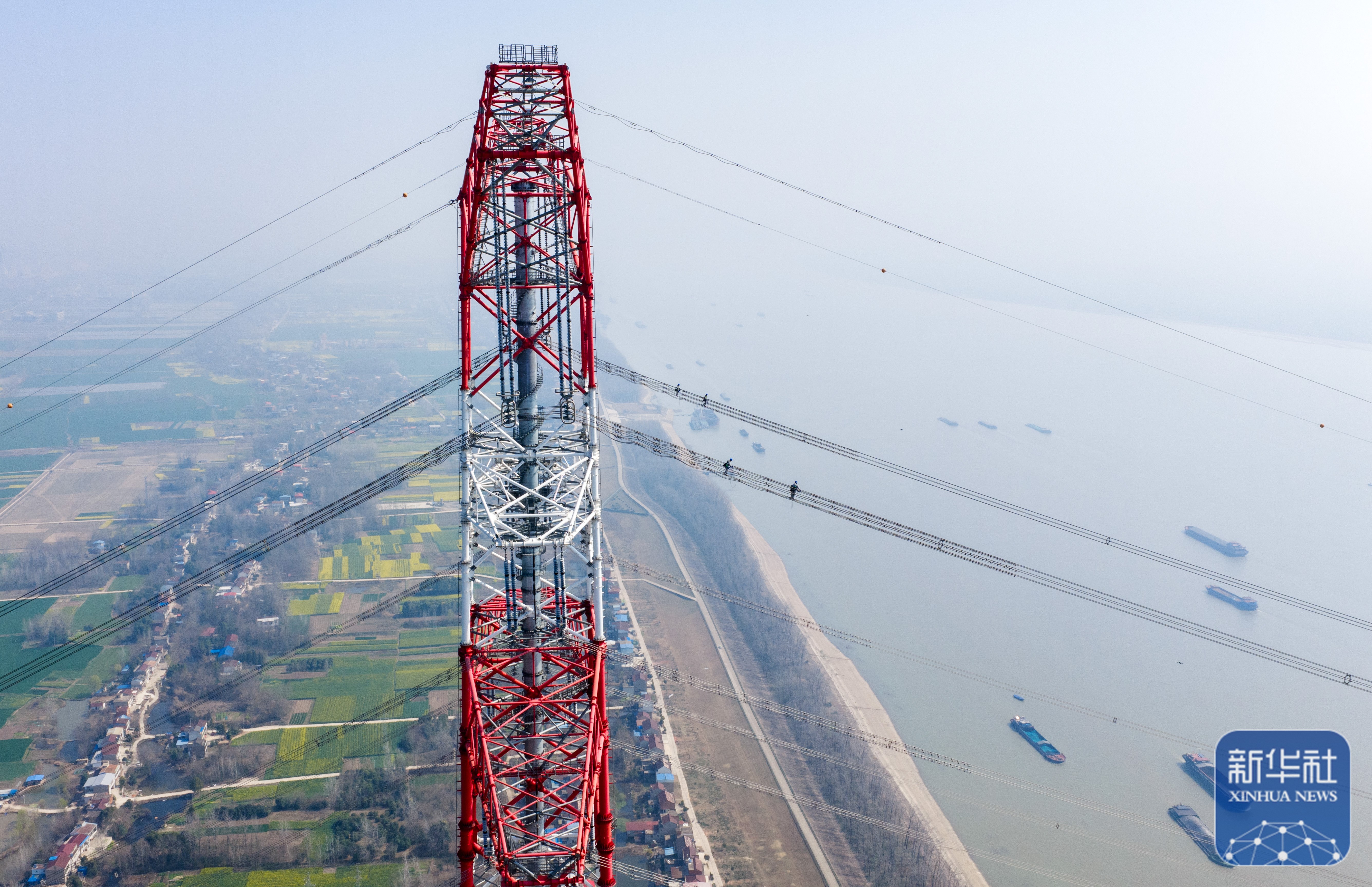 ↑ 3月10日,在安徽省铜陵市枞阳县长江边,安徽送变电工程有限公司检修人员在300多米高空进行检修作业(无人机照片)。新华社发(郑贤列摄)