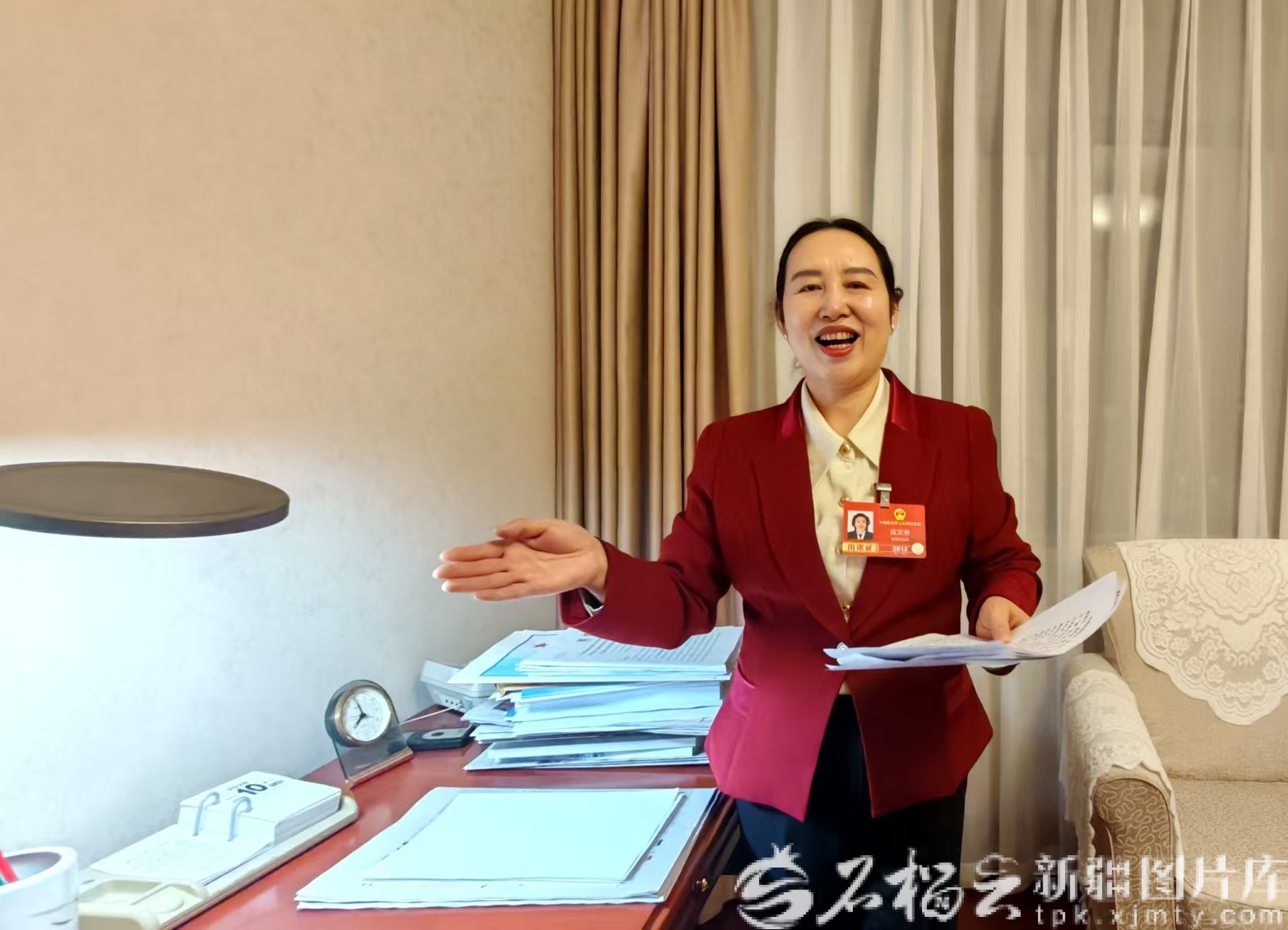 3月10日晚,全国人大代表吴文秀向记者讲述当日上午发言时的心情。石榴云/新疆日报记者王娜 摄