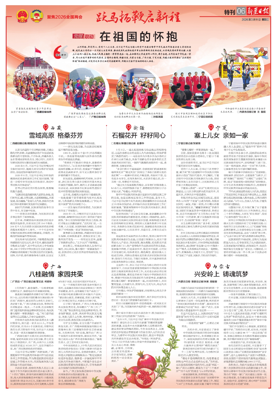 山河同脉,华夏同心。党的十八大以来,以习近平同志为核心的党中央提出铸牢中华民族共同体意识重大原创性论断,就民族工作作出一系列重大决策部署,推动我国民族团结进步事业取得新的历史性成就。从雪域高原到草原北疆,从塞上江南到八桂大地,各族人民像石榴籽一样紧紧抱在一起,在祖国的大家庭里同心同行、携手奋进,共同奏响中华民族一家亲、同心共筑中国梦的时代强音。全国两会期间,新疆日报、内蒙古日报、广西日报、宁夏日报、西藏日报共同推出“在祖国的怀抱”联动报道,以笔墨记录手足相亲的温暖瞬间,用镜头定格守望相助的动人画卷。