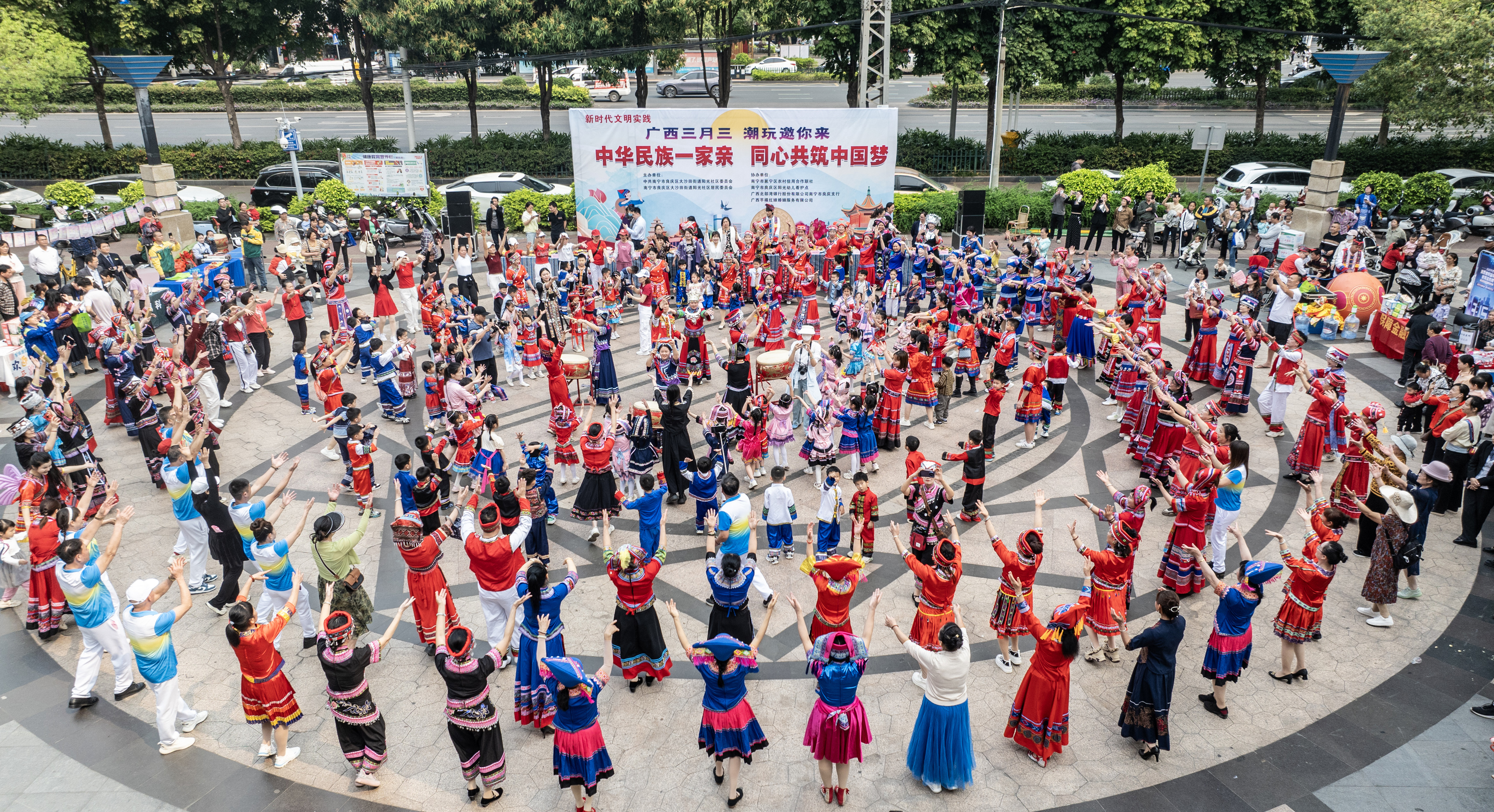 2025年3月26日,南宁市良庆区阳光社区举办“广西三月三 潮玩邀你来”主题活动,社区各民族居民身穿节日盛装,载歌载舞欢庆佳节。广西日报供图
