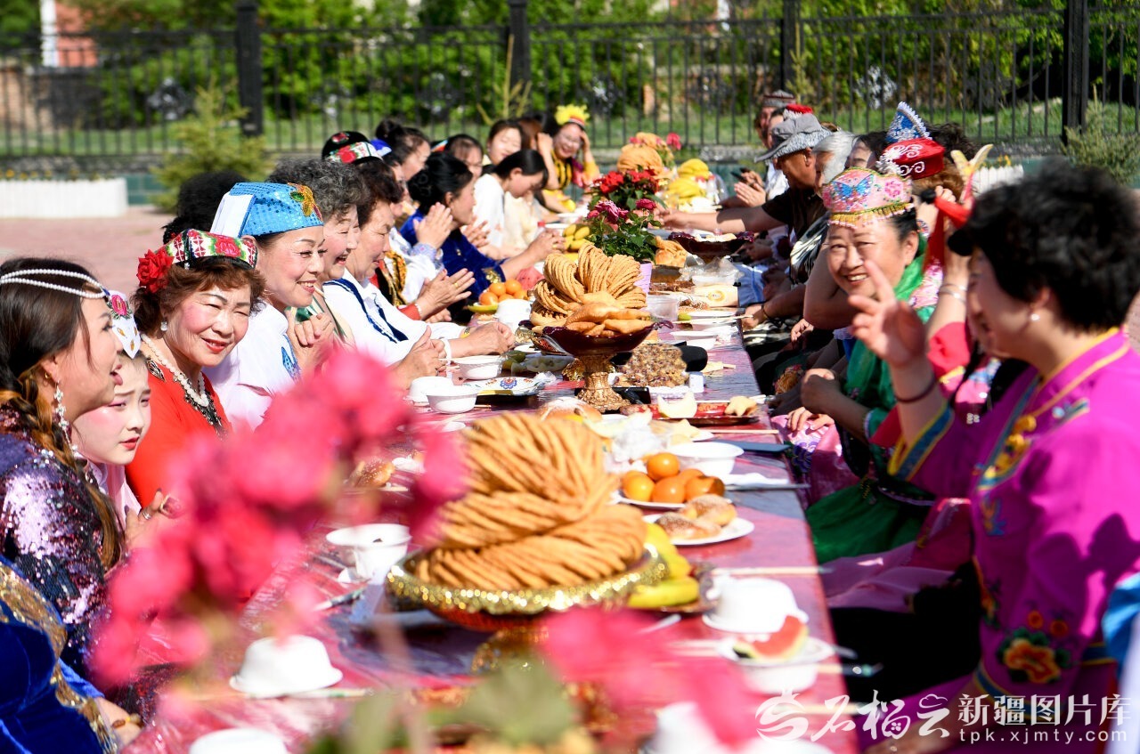 2025年5月17日,塔城市新城街道哈尔墩社区居民在邻里节“百家宴”上品尝美食。石榴云/新疆日报记者 汤永摄