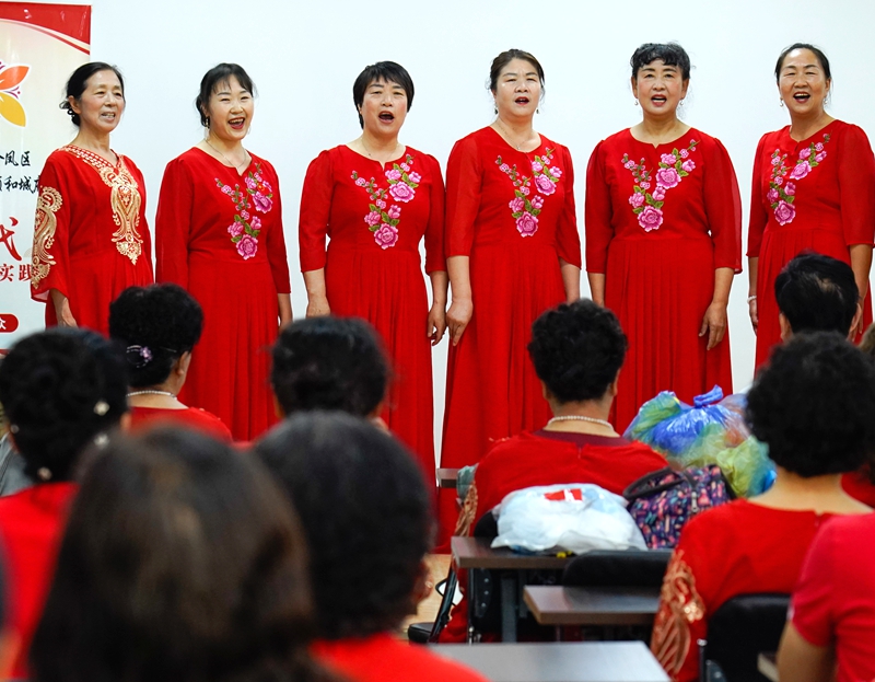 银川市金凤区颐和城府社区夕阳红艺术团成员在表演节目。宁夏日报供图