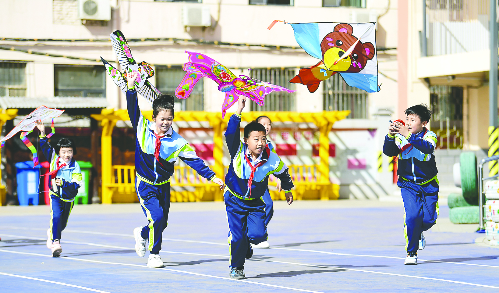 呼和浩特市玉泉区恒昌店巷小学各族学生在放风筝。内蒙古日报记者 王磊摄
