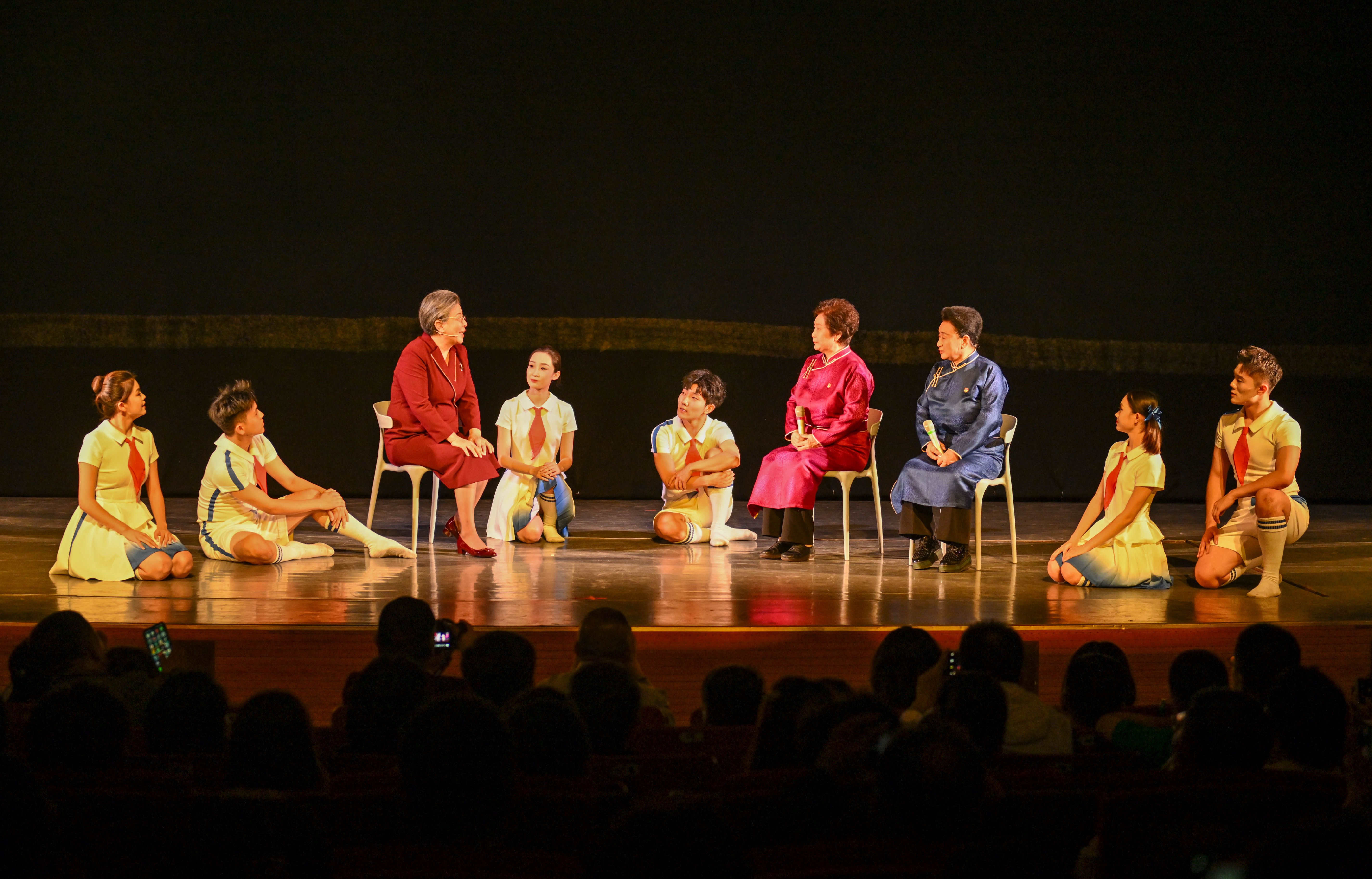 2024年9月10日,草原英雄小姐妹龙梅、玉荣在讲述自己的故事。当日,为切实将铸牢中华民族共同体意识融入教育教学全过程,内蒙古艺术学院历经数轮创作排演的“北疆儿女心向党——剧场里的思政课Ⅱ”在该校演艺厅精彩上演。内蒙古日报记者 王磊摄
