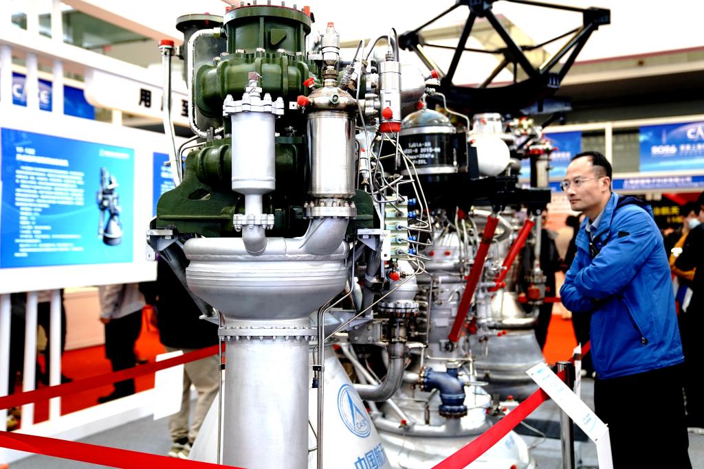 3月12日,观众在2026首届上海商业航天大会暨展览会上参观一款火箭发动机。