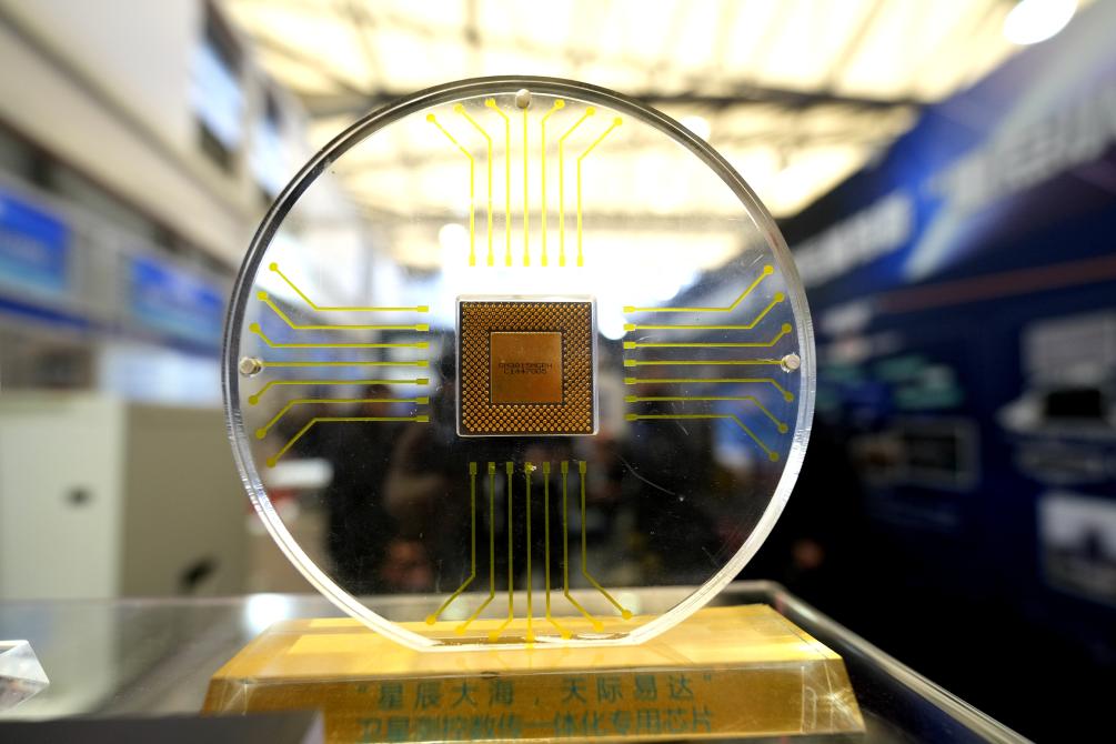 3月12日在2026首届上海商业航天大会暨展览会上拍摄的一款卫星测控数传一体化专用芯片。