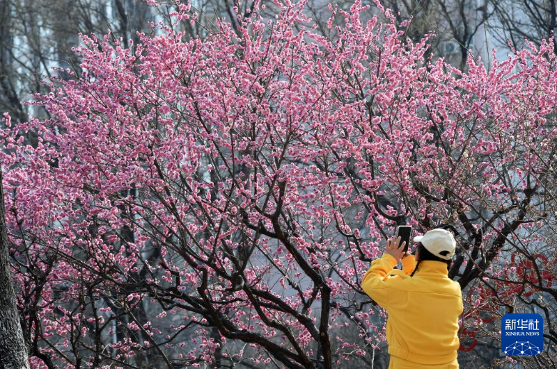 3月16日,一名游客在北京明长城遗址公园拍摄绽放的梅花。