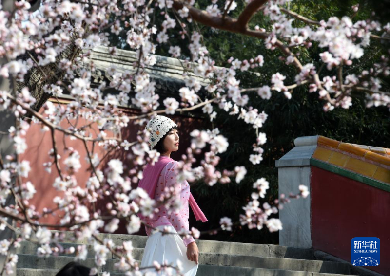 3月16日,一名游客在北京北海公园拍照留影。