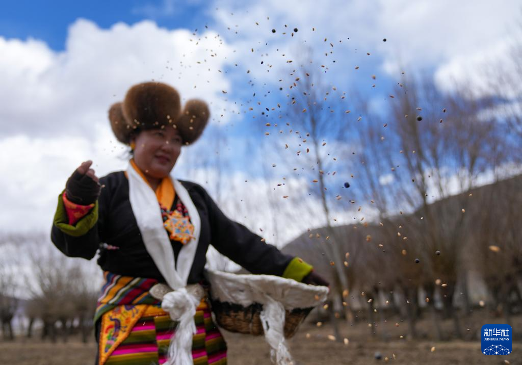 3月16日,西藏山南市结巴乡结巴村村民身着盛装,在新犁开的田地上播撒种子。