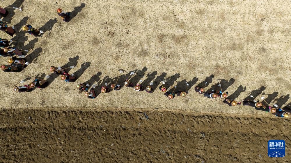3月16日,西藏山南市结巴乡结巴村举行春耕仪式(无人机照片)。