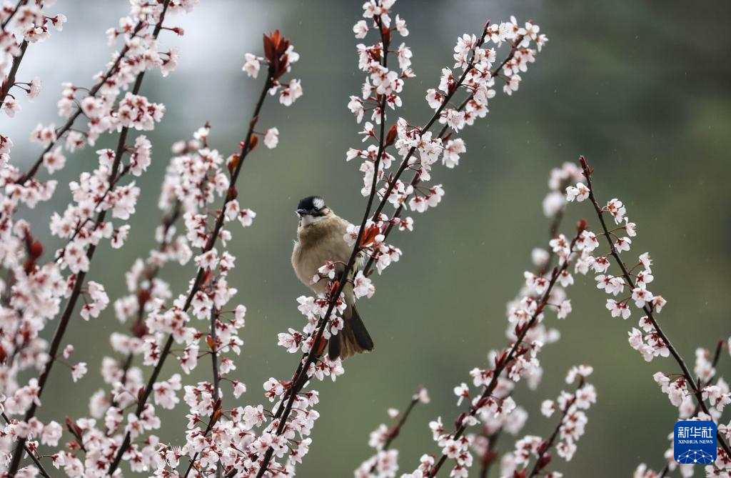 3月16日,小鸟在贵州省铜仁市玉屏侗族自治县皂角坪街道茅坪村的花间觅食。新华社发(胡攀学摄)