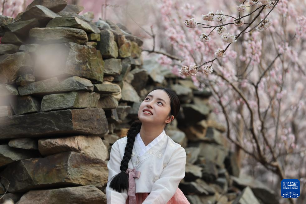 3月15日,游人在江苏省连云港市云台山景区樱桃谷赏花拍照。新华社发(司伟摄)