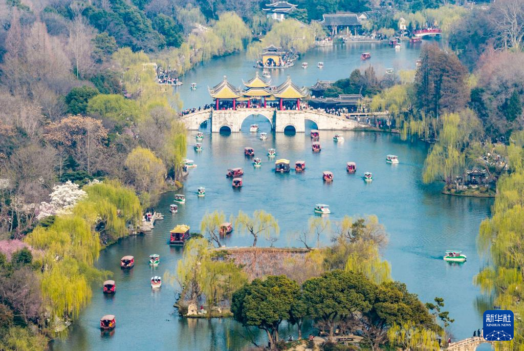 3月15日,游客在江苏扬州瘦西湖风景区赏景游玩(无人机照片)。新华社发(周社根摄)