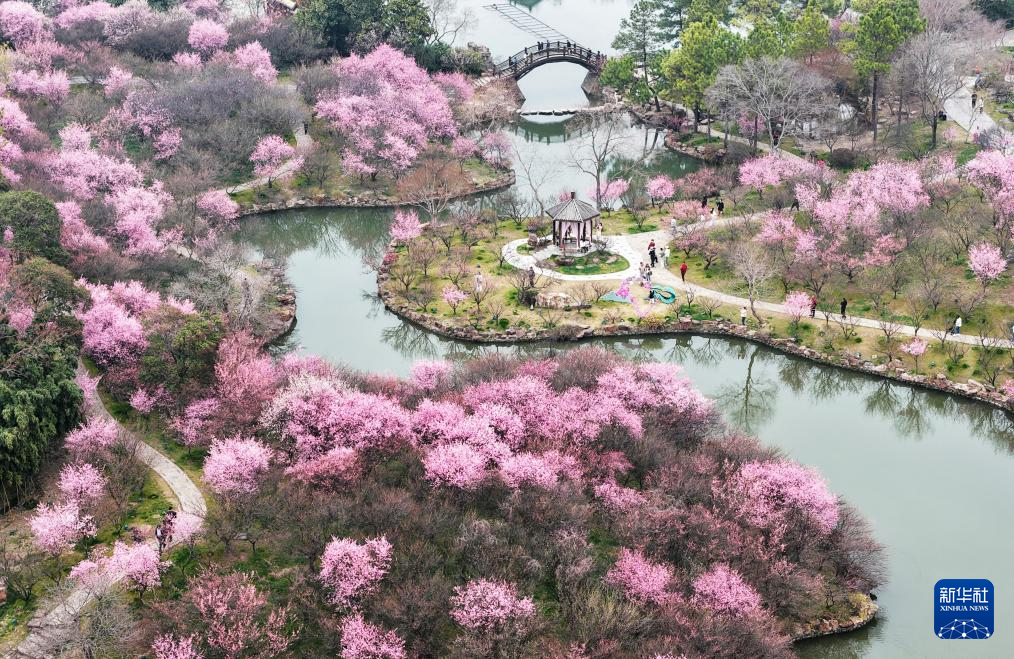 3月15日,游客在江苏扬州瘦西湖风景区赏花游玩(无人机照片)。新华社发(孟德龙摄)