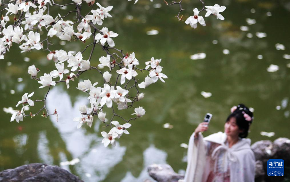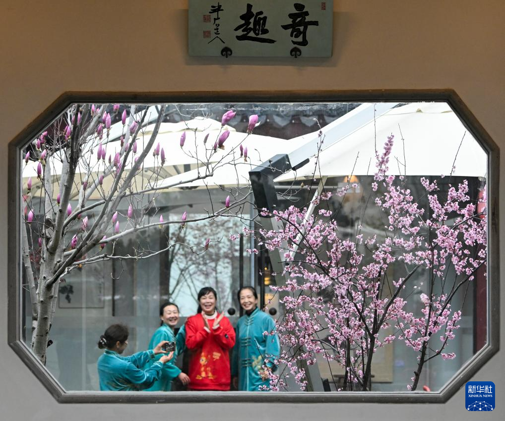 3月18日,游客在江苏省扬州市何园景区赏花拍照。新华社发(孟德龙摄)