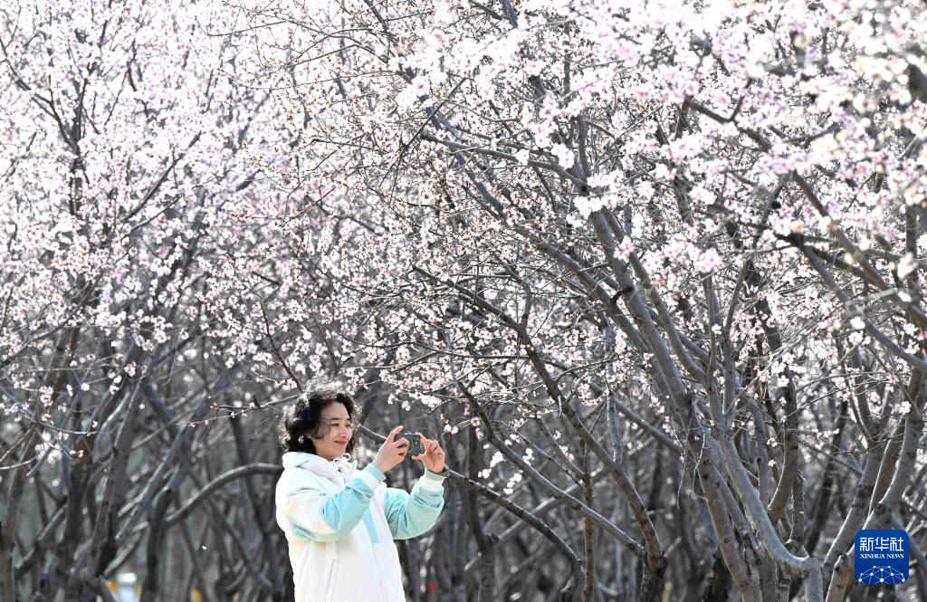 3月18日,游人在河北省石家庄市桥西区环城水系绿地拍摄山桃花。新华社发(陈其保摄)