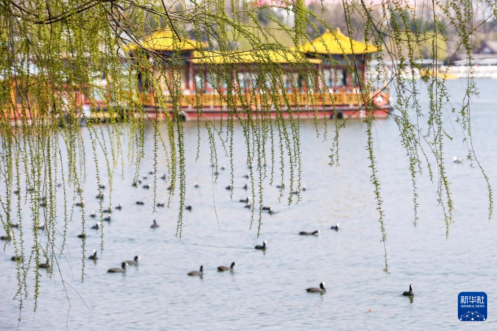 3月19日,在山东省济南市大明湖,杨柳依依,一群白骨顶鸡畅游湖水之中。新华社发(郝鑫城摄)