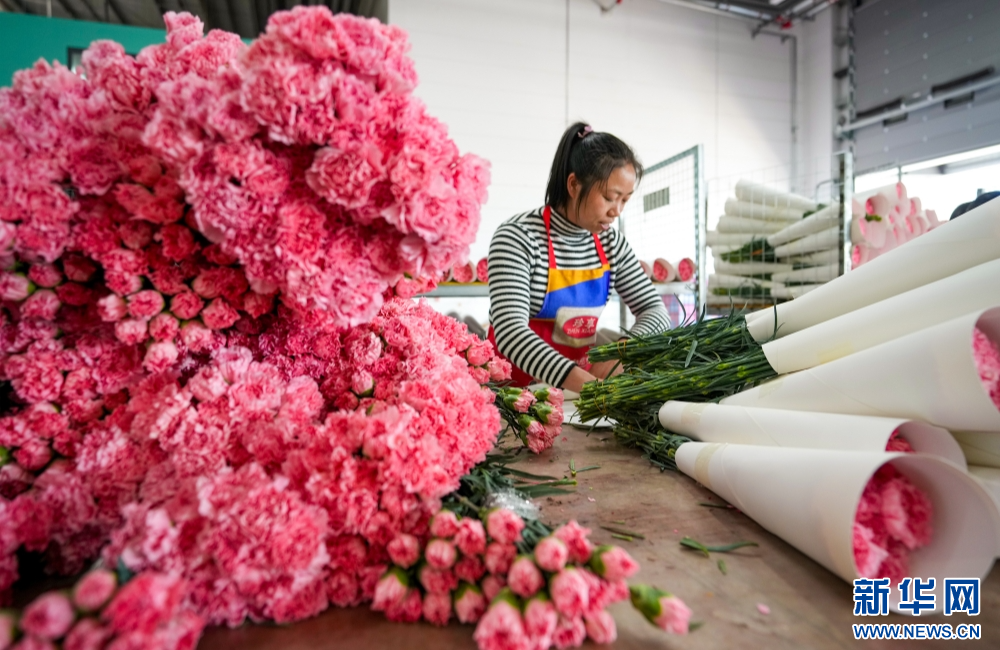 1月22日,一名工作人员在昆明云舍花卉有限公司包装鲜花。新华社记者 陈欣波 摄