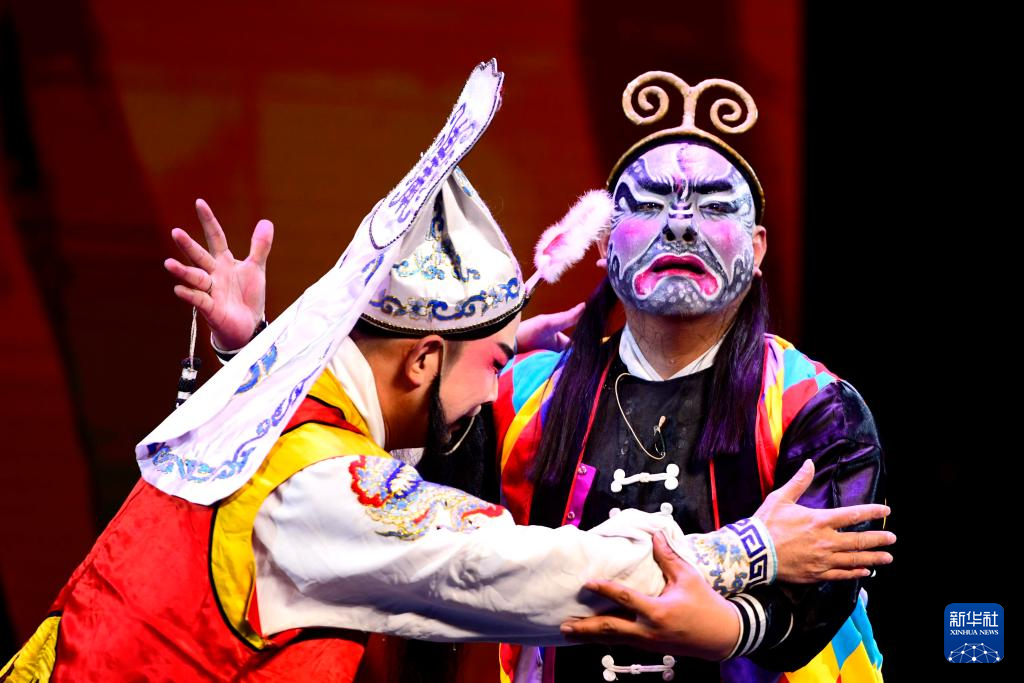3月20日,在博兴县市民文化中心,来自广东省陆丰市正字戏传承保护中心的戏曲演员在表演正字戏《昊天塔·五台山会兄》。新华社记者 郭绪雷 摄