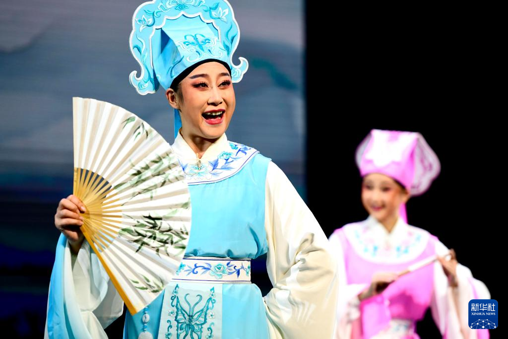 3月20日,在博兴县市民文化中心,来自云南省大理白族自治州白剧团的戏曲演员在表演白剧《柳荫记·十八相送》。新华社记者 郭绪雷 摄