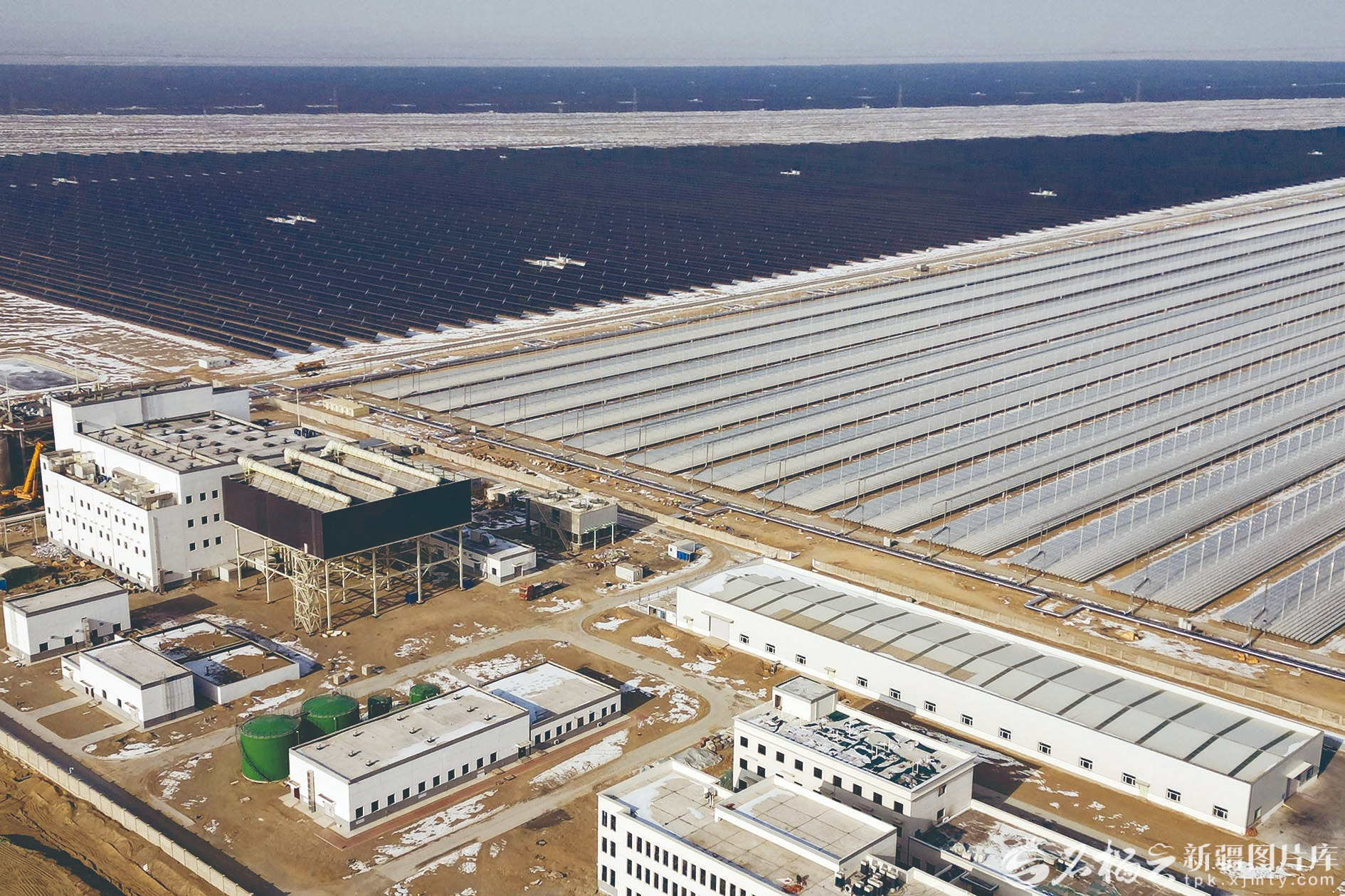 在哈密市伊州区北部拍摄的大唐石城子100万千瓦“光热+光伏”一体化清洁能源示范项目一角(无人机摄)。蔡增乐 摄