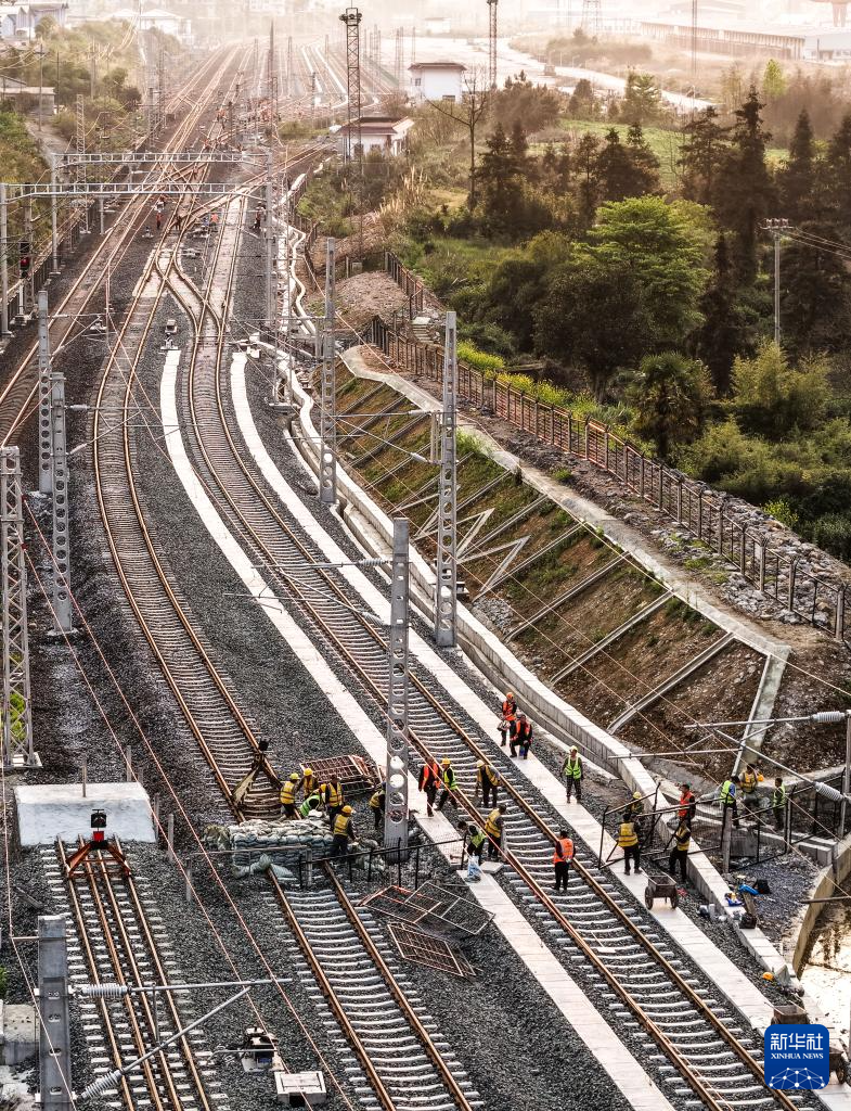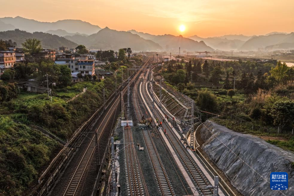 3月30日,工人在贵州瓮马铁路南北延伸线绿荫湖站改造工程现场施工(无人机照片)。新华社记者 杨文斌 摄