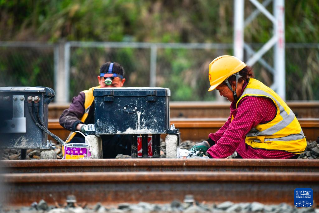 3月30日,工作人员在贵州瓮马铁路南北延伸线绿荫湖站改造工程现场进行信号联锁试验。新华社记者 杨文斌 摄