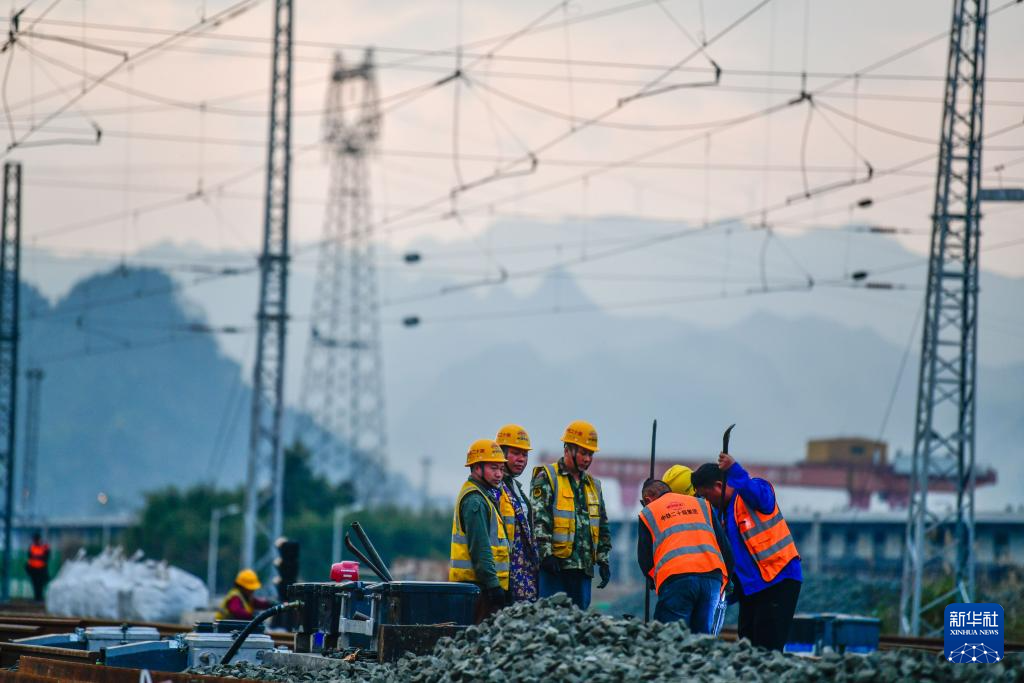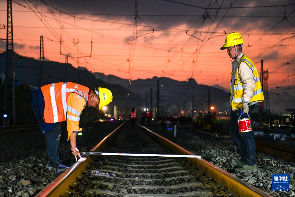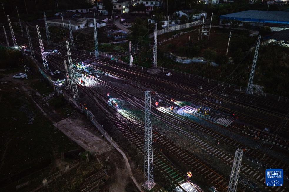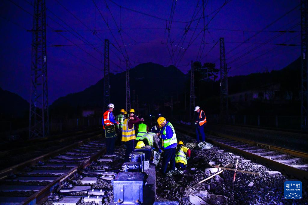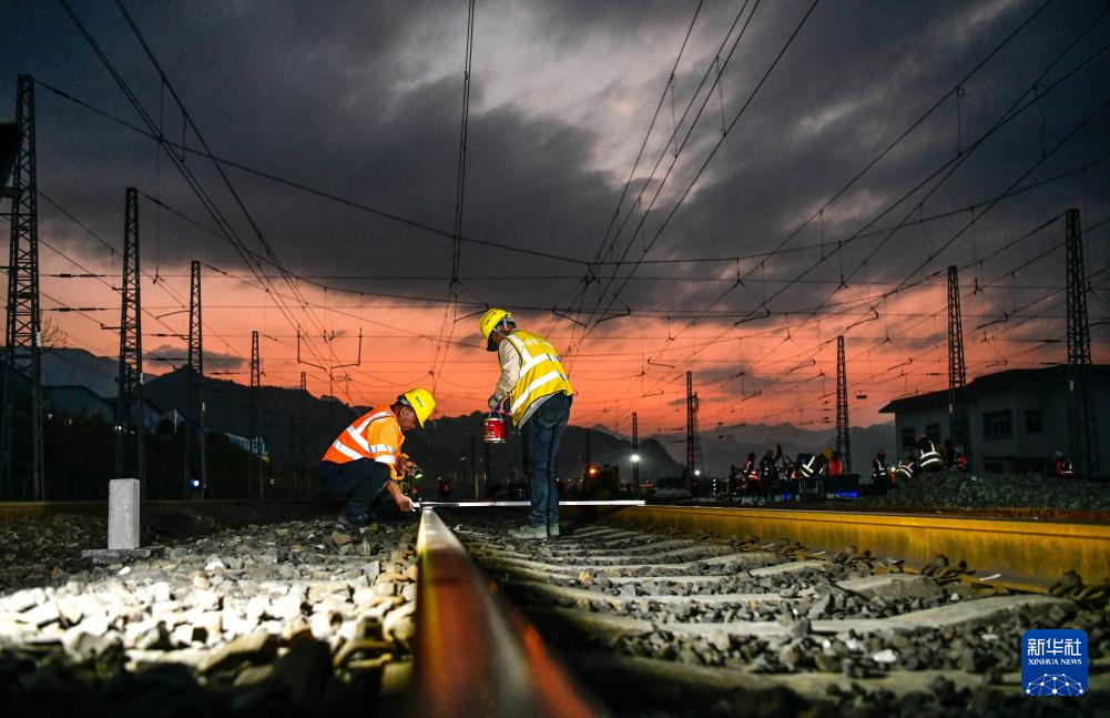 3月30日晚,工人在贵州瓮马铁路南北延伸线绿荫湖站改造工程现场施工。新华社记者 杨文斌 摄