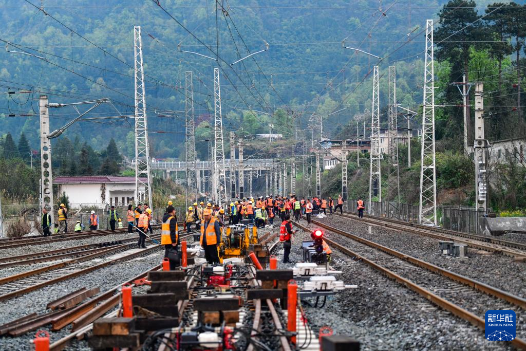 3月30日,工人在贵州瓮马铁路南北延伸线绿荫湖站改造工程现场施工。新华社记者 杨文斌 摄