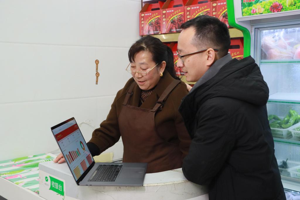 3月18日,在江苏盱眙马坝镇,经营小龙虾餐饮店的戴庆华(左)和儿子一起查看用腾讯AI智能体Workbuddy生成的小龙虾行情报表。戴庆华在儿子的协助下,使用Workbuddy帮她撰写朋友圈营销文案、每日自动生成“店长经营日报”、实时同步江苏小龙虾批发行情等。