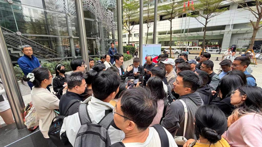 3月6日,人们在深圳腾讯大厦北广场听取工作人员讲解安装“龙虾”的方法。
