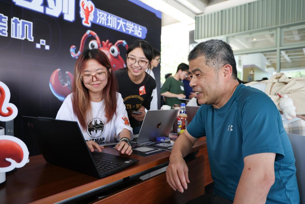 3月19日,“腾讯AI百校行高校龙虾专列”走进深圳大学,一名学生(左)在志愿者的指导下安装腾讯AI智能体Workbuddy。