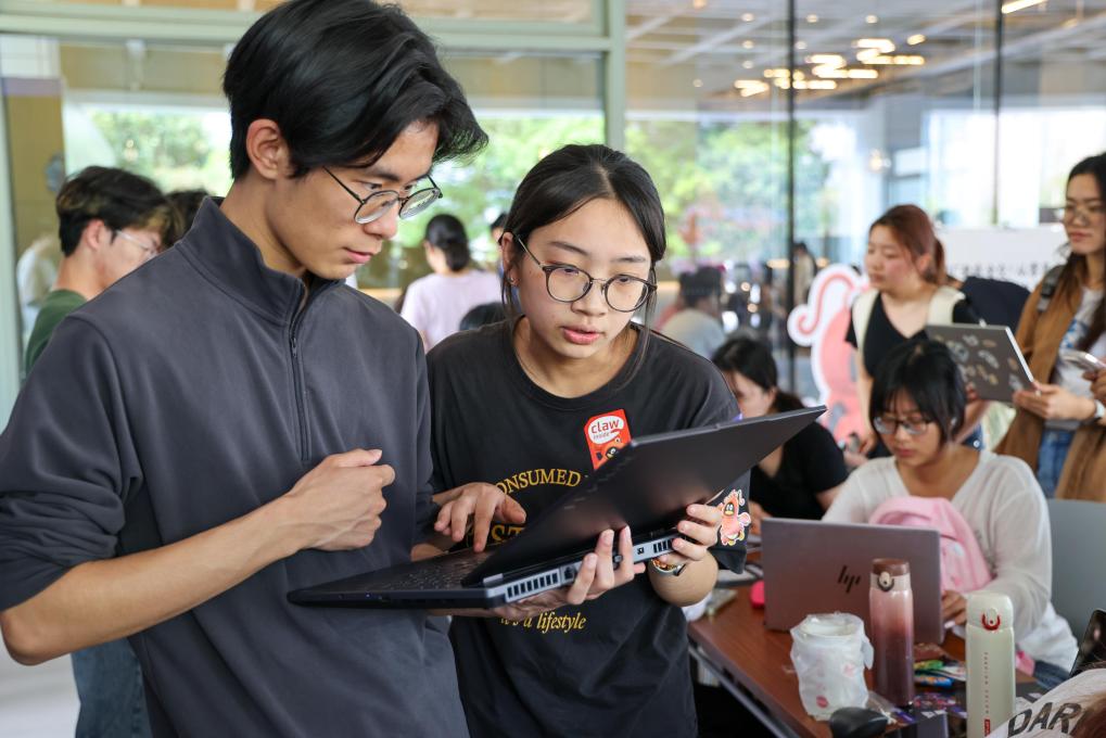 3月19日,在“腾讯AI百校行高校龙虾专列”深圳大学活动现场,学生扫码了解如何“科学养虾”。