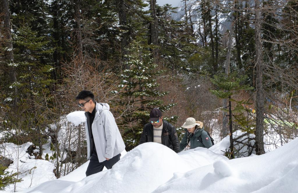 2026年3月21日,游人和当地向导徒步进入白普隆沟牧场。新华社记者 洛卓嘉措 摄