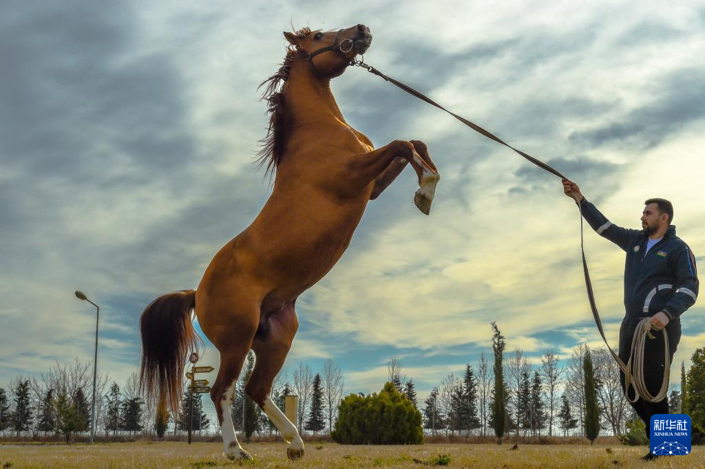 2月17日,在阿塞拜疆中南部地区阿格贾巴季,训练师在驯马。新华社记者 陈俊锋 摄