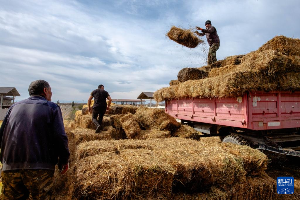 2月17日,在阿塞拜疆中南部地区阿格贾巴季,卡拉巴赫马繁育和马术运动综合体工作人员在卸草料。新华社记者 陈俊锋 摄