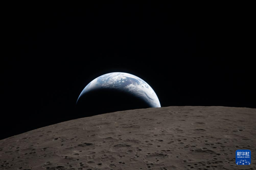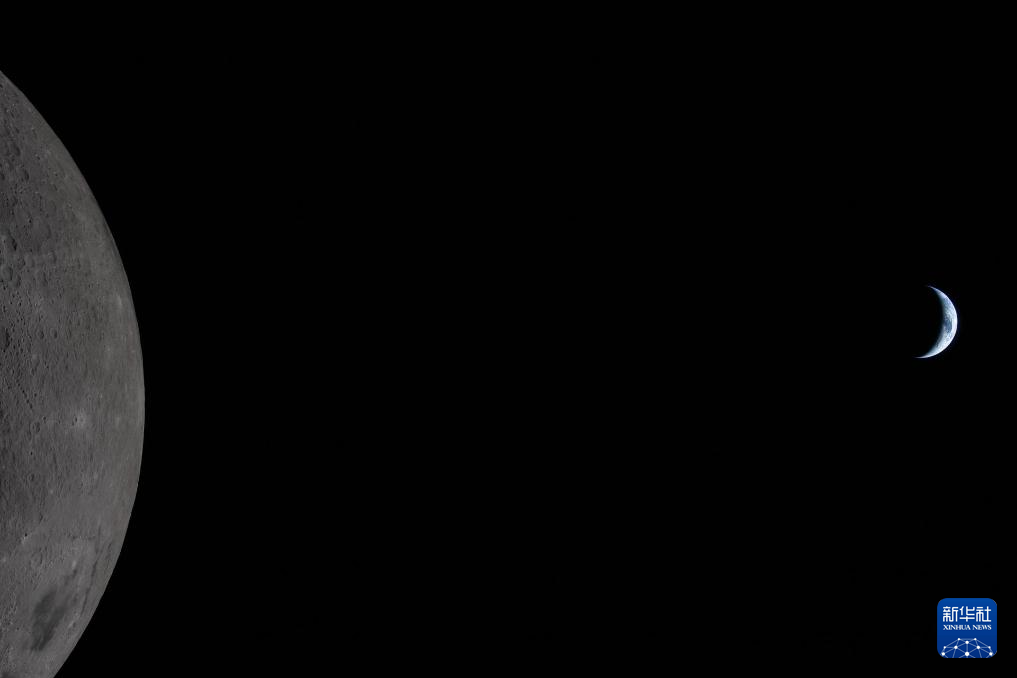 这是4月6日从执行“阿耳忒弥斯2号”载人绕月飞行任务的“猎户座”飞船上拍摄的月球(前)和地球。新华社发(美国国家航空航天局供图)