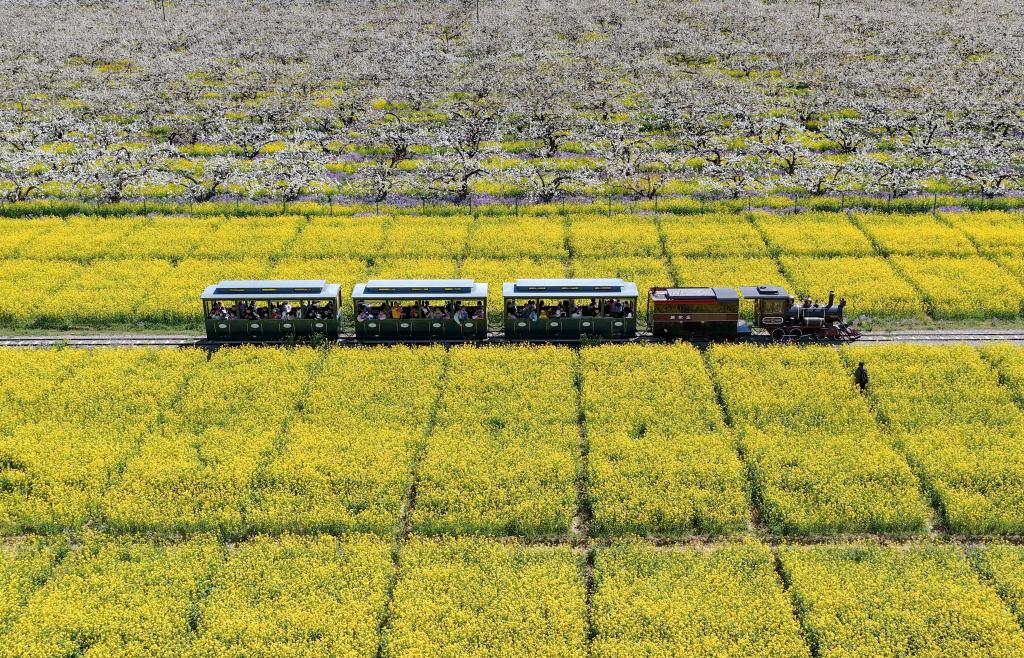 4月6日,游客乘观光小火车从河北省晋州市周家庄乡第九生产队梨园旁经过(无人机照片)。新华社记者 杨世尧 摄
