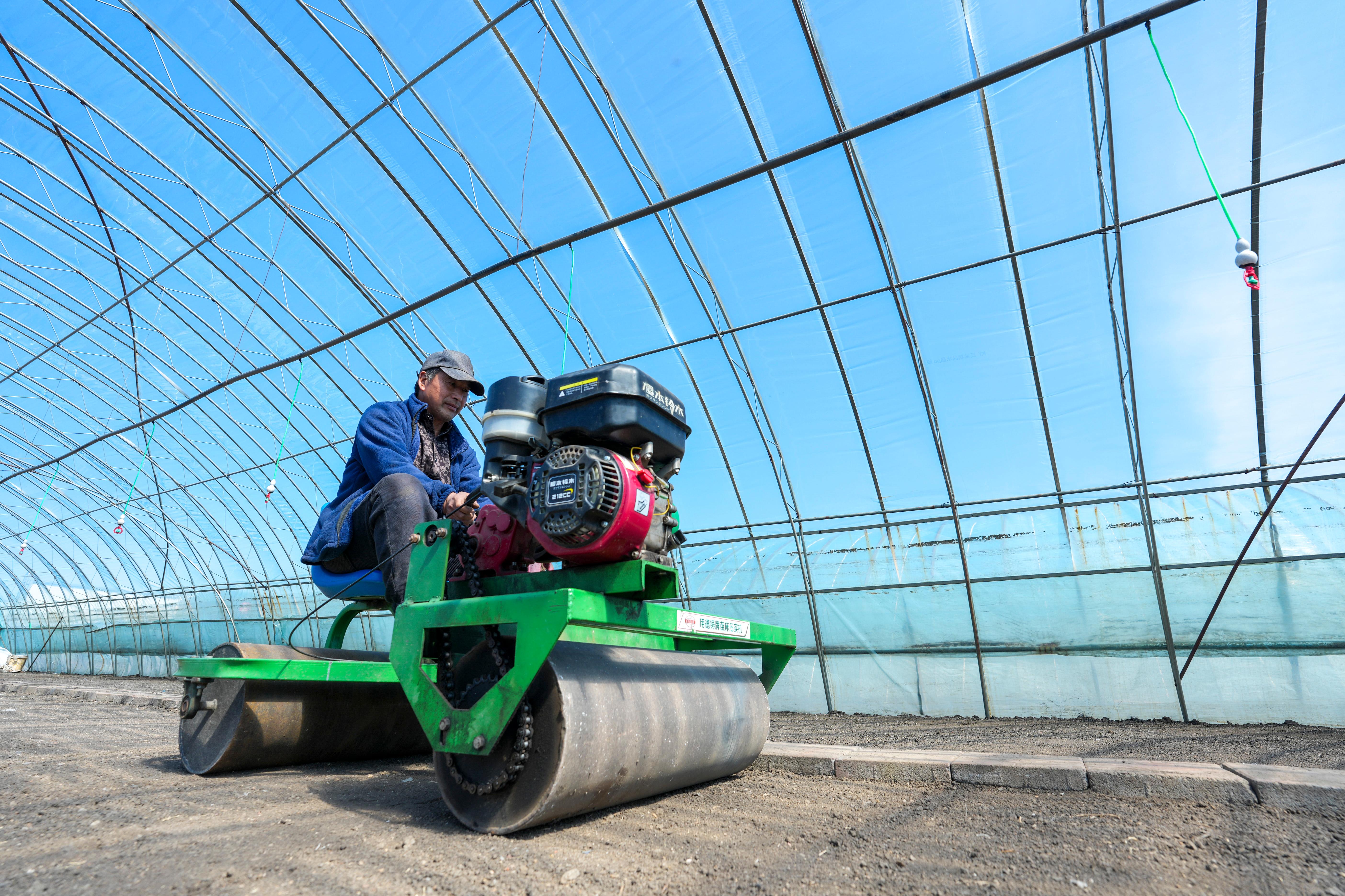 在黑龙江省双鸭山市的黑龙江北大荒农业股份有限公司友谊分公司第三管理区水稻育秧大棚中,农户在平整苗床土壤(4月9日摄)。