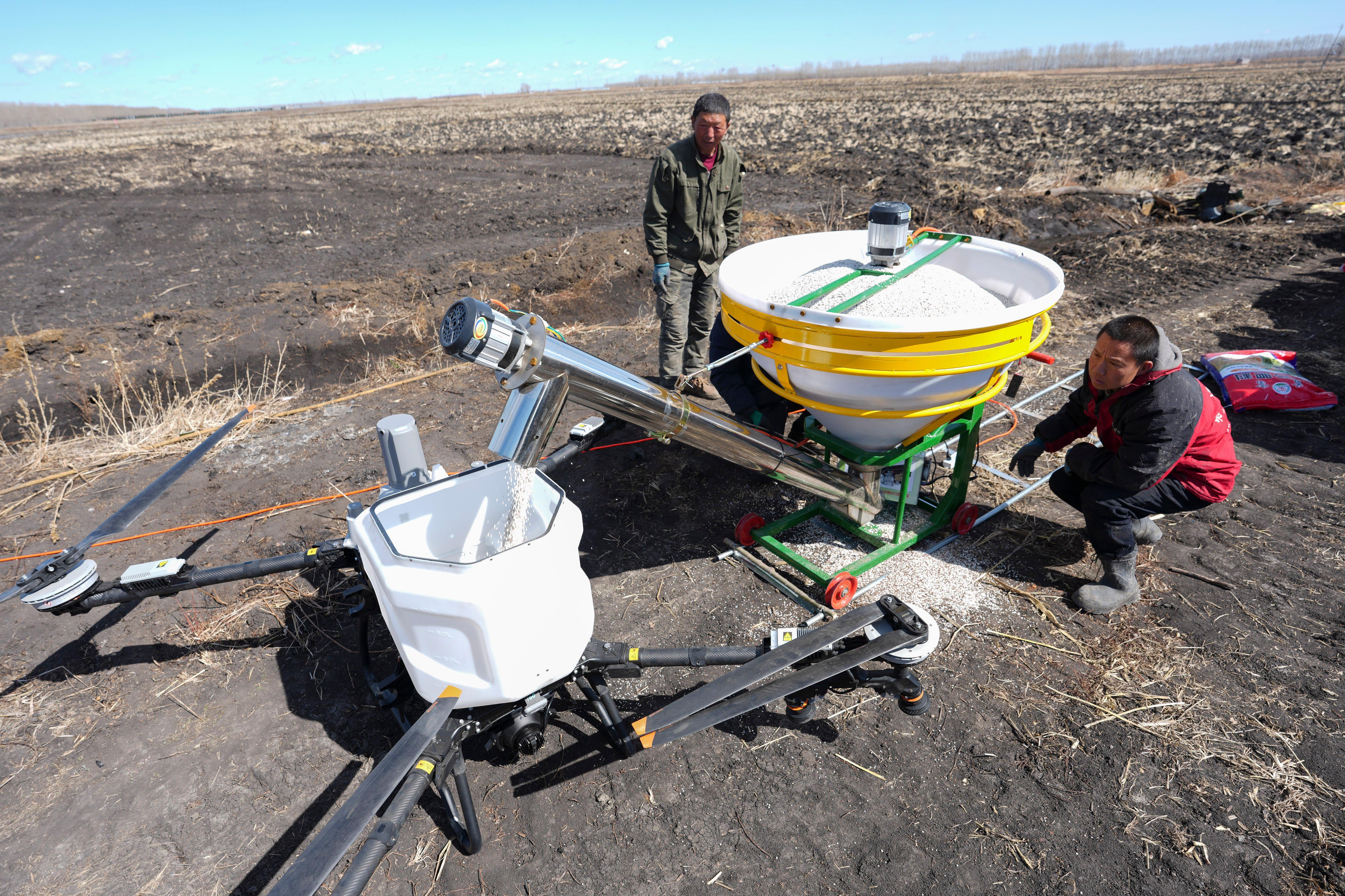 在黑龙江省双鸭山市的黑龙江北大荒农业股份有限公司友谊分公司第九管理区,农户将稻田肥料放置到农业无人机中(4月9日摄)。