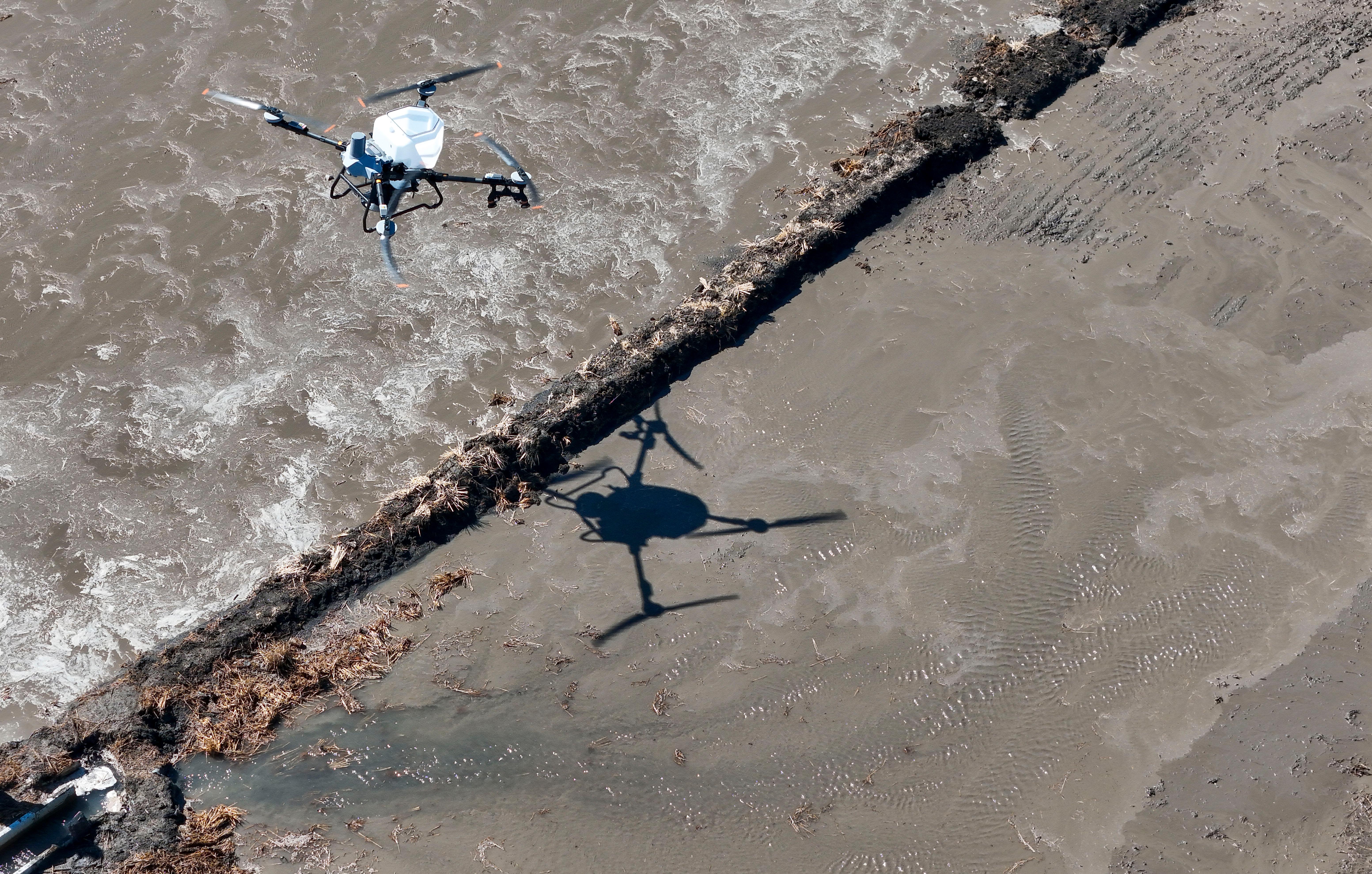 在黑龙江省双鸭山市的黑龙江北大荒农业股份有限公司友谊分公司第九管理区,农户操作农业无人机开展稻田施肥作业(4月9日摄)。