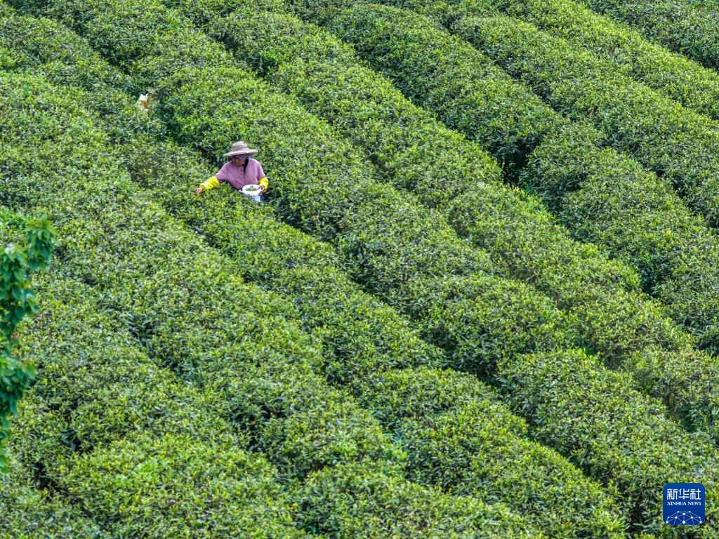4月9日,茶农在青龙乡茶叶基地内采摘春茶。新华社记者 唐奕 摄